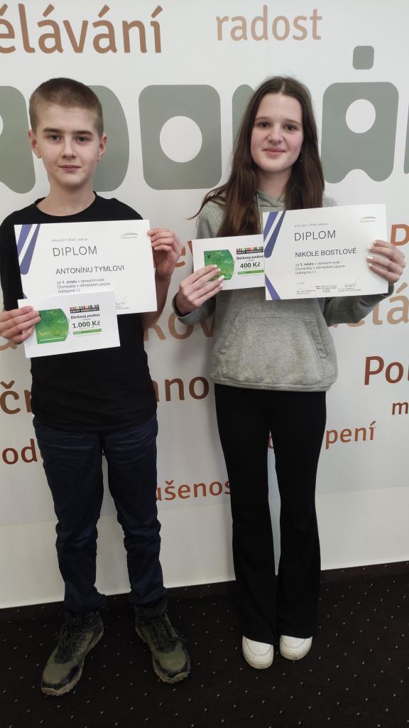 V únoru jsme se zúčastnili okresního kola Olympiády z německého jazyka v Radovánku v Plzni. Sedmou třídu v kategorii pro základní školy a víceletá gymnázia I. reprezentoval žák ze 7. A Antonín Tyml. Získal krásné 1. místo a postupuje do krajského kola. Zahanbit se nenechala ani žákyně Nikola Bostlová ze 7. B, která vybojovala výborné 3. místo. Kategorii II. pro 8. a 9. třídy zastupovaly dívky z 9. A Eliška Luňáčková a Elena Kondelíková. Žáci se velice cílevědomě na olympiádu připravovali a jejich úsilí přineslo vysněné ovoce.