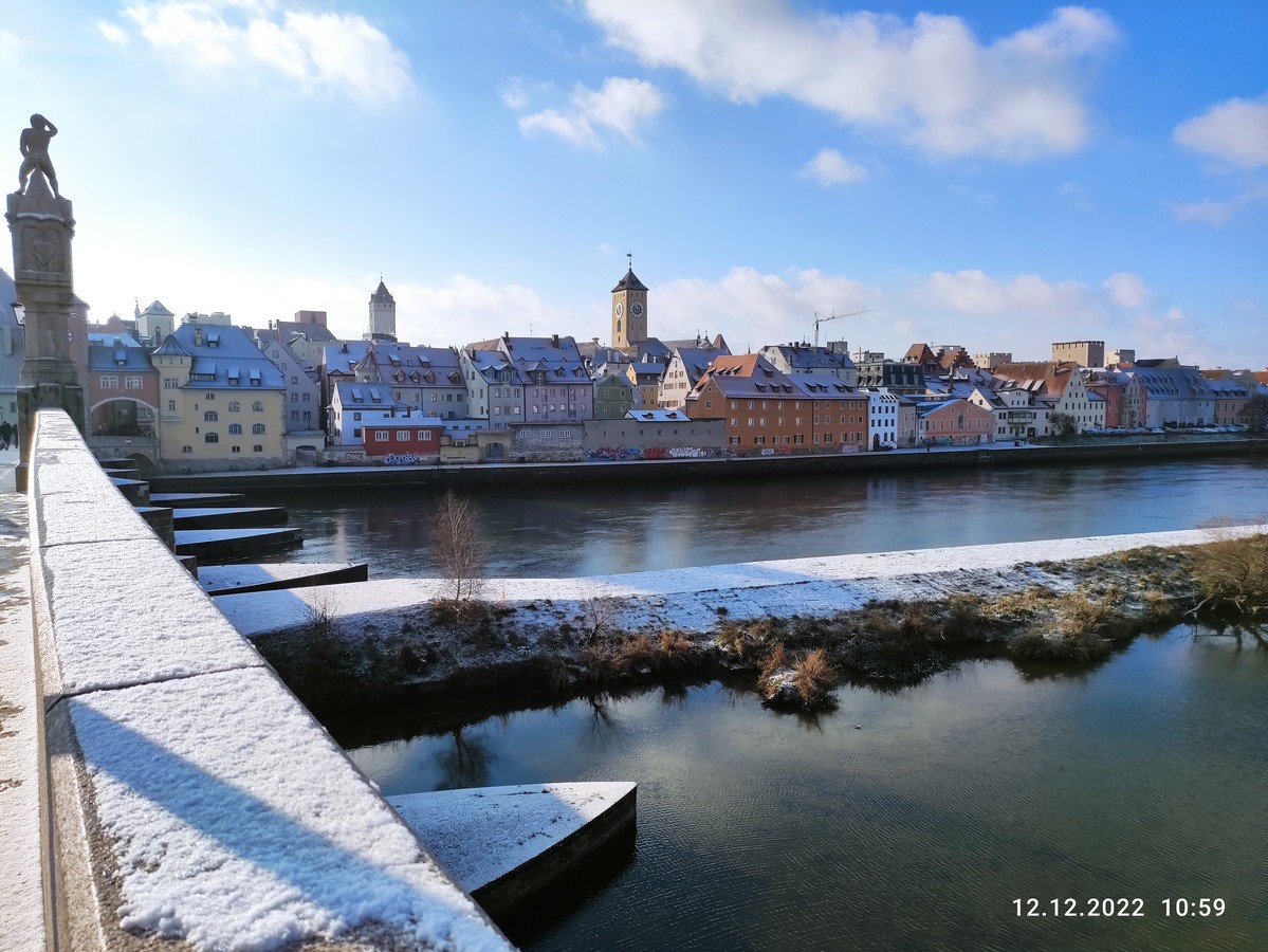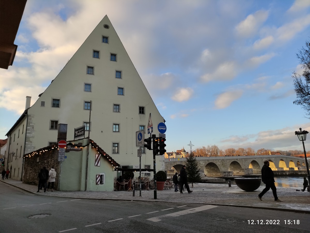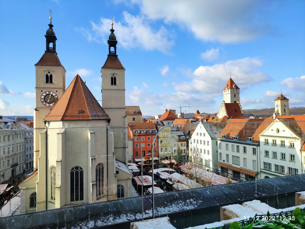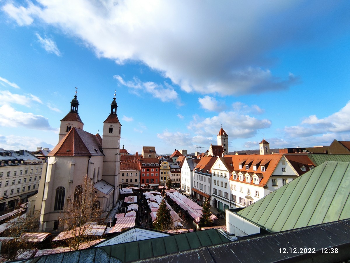 v Německu Steinerne Brücke (Kamenný most) jsme došli na jedny z nejkrásnějších vánočních trhů v Německu, a to konkrétně na Lucrezia-Markt na Kohlemarkt a opodál na Haidplatz a dále na vánoční trhy na Neupfarrplatz, u kterého jsme zamířili i na nákupy suvenýrů a vánočních dárků do Galeria Kaufhof, jejíž střecha nám poskytla nejen možnost občerstvení, ale především krásný výhled na historické centrum.
