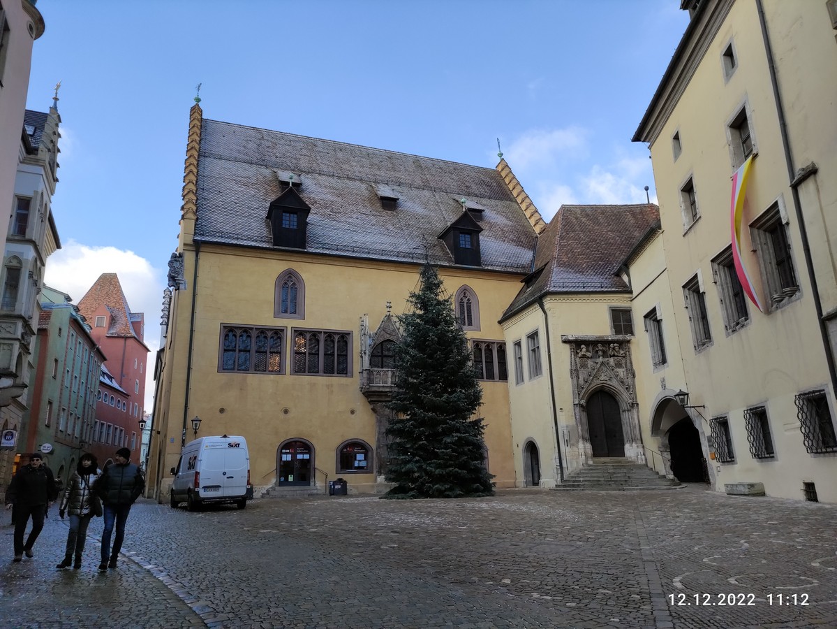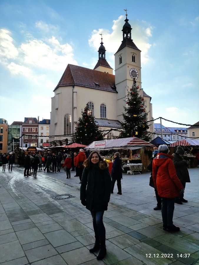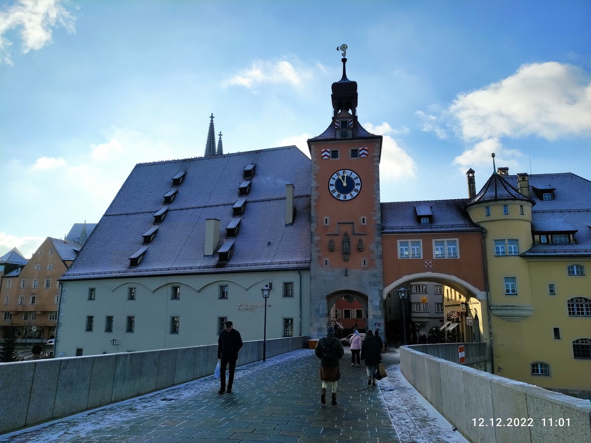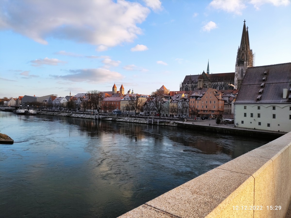 v Německu Steinerne Brücke (Kamenný most) jsme došli na jedny z nejkrásnějších vánočních trhů v Německu, a to konkrétně na Lucrezia-Markt na Kohlemarkt a opodál na Haidplatz a dále na vánoční trhy na Neupfarrplatz, u kterého jsme zamířili i na nákupy suvenýrů a vánočních dárků do Galeria Kaufhof, jejíž střecha nám poskytla nejen možnost občerstvení, ale především krásný výhled na historické centrum.