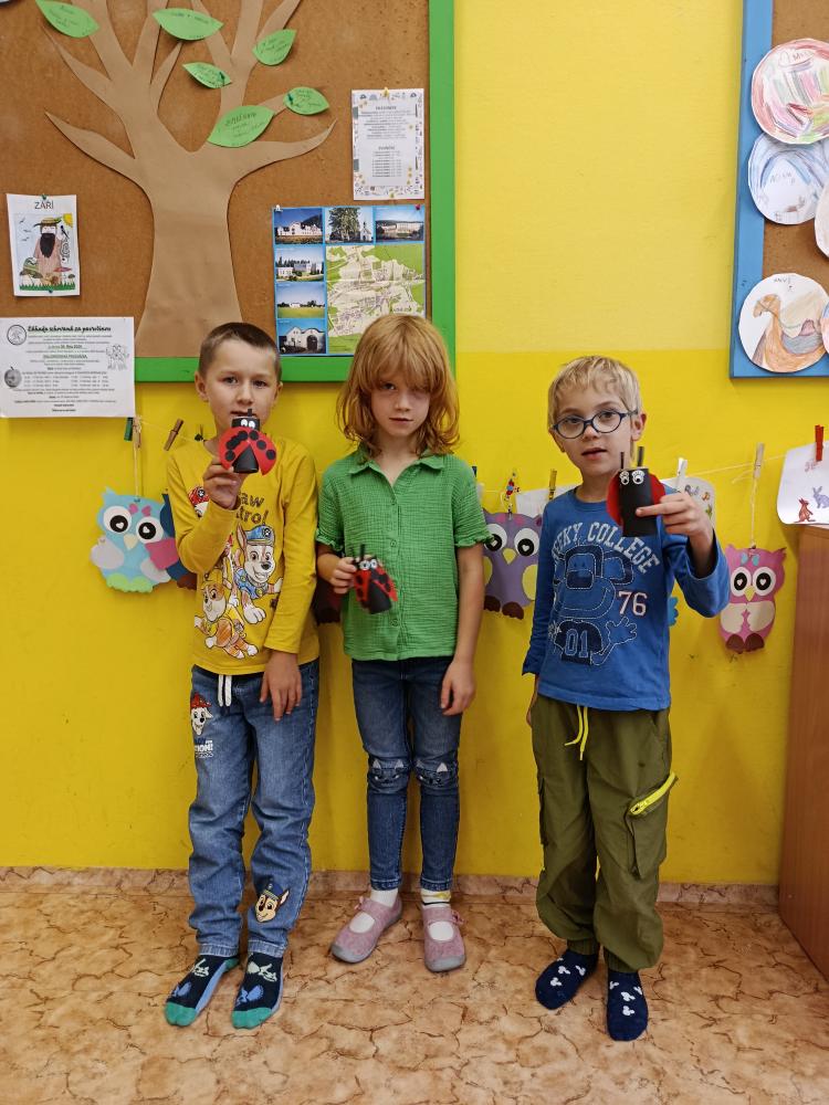 Náplň za měsíc září: omalovánka na nástěnku - školák, družinová housenka, pavučina jmen - poznávání spolužáků, výroba berušky z ruličky, společná práce - zdobení deštníku, vyrábění ježečkové čelenky, loutkové divadlo - Princezna a Kuba.
