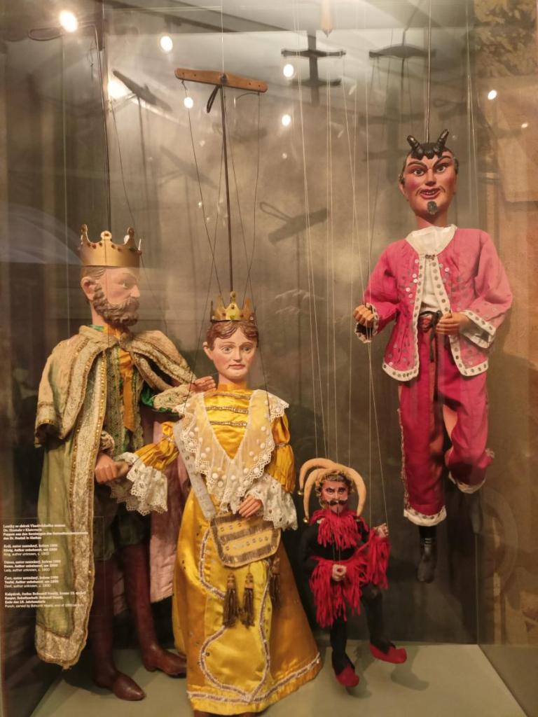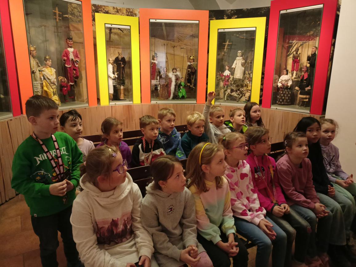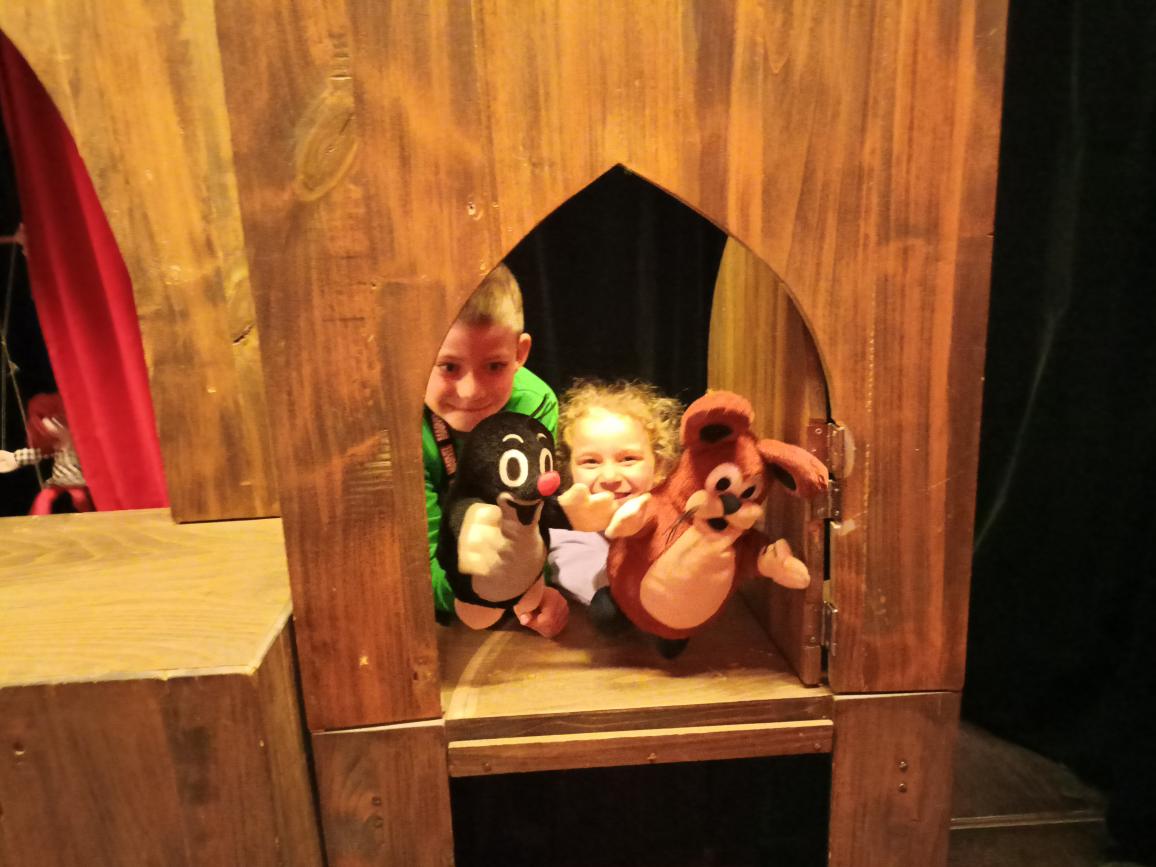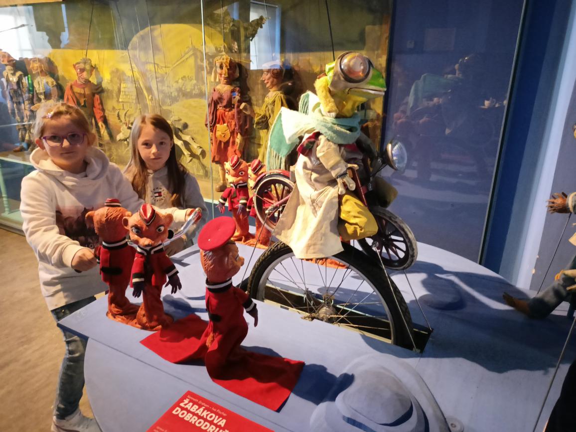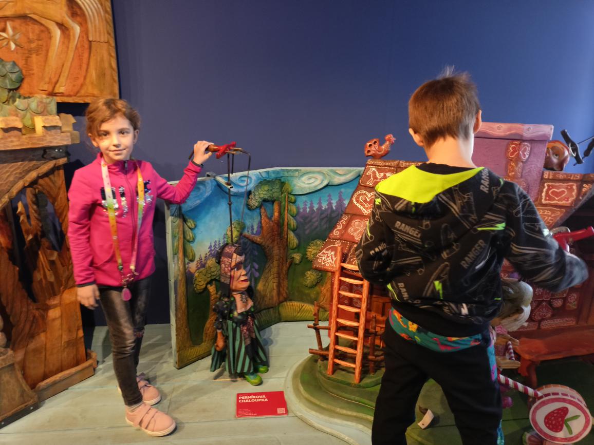 Paní průvodkyně nám ukázala různé druhy loutek, dozvěděli jsme se zajímavosti o vzniku a výrobě loutek, o kočovném divadle, prohlédli jsme si krásné exponáty loutek, maňásků, marionet a dokonce si děti mohly samy zahrát divadlo na "prknech, co znamenají svět". Na závěr jsme si vyrobili sice papírovou ale pohyblivou loutku. A samozřejmě nemohl chybět nákup suvenýrů. :-)