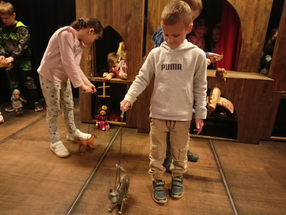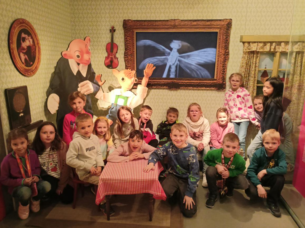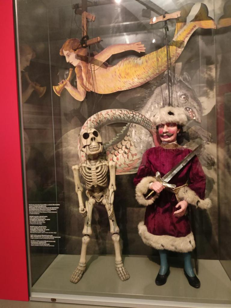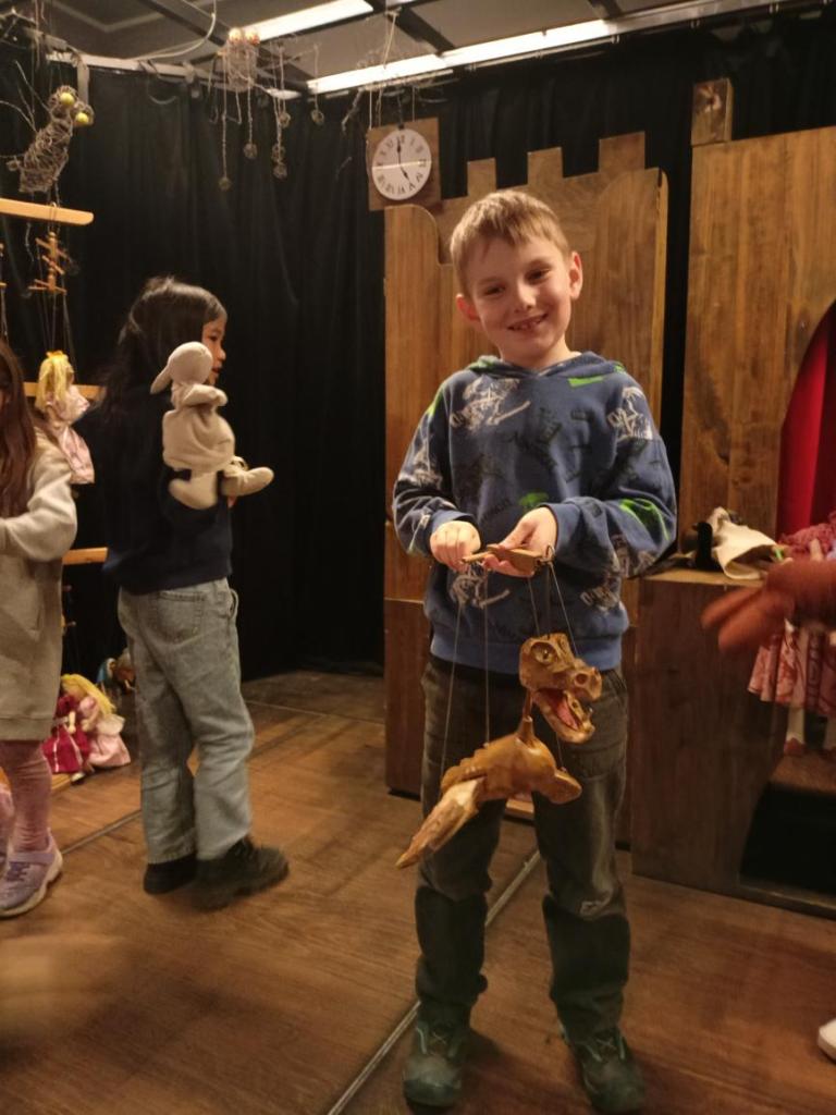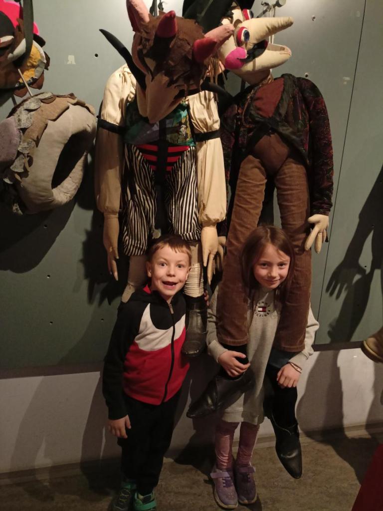 Paní průvodkyně nám ukázala různé druhy loutek, dozvěděli jsme se zajímavosti o vzniku a výrobě loutek, o kočovném divadle, prohlédli jsme si krásné exponáty loutek, maňásků, marionet a dokonce si děti mohly samy zahrát divadlo na "prknech, co znamenají svět". Na závěr jsme si vyrobili sice papírovou ale pohyblivou loutku. A samozřejmě nemohl chybět nákup suvenýrů. :-)