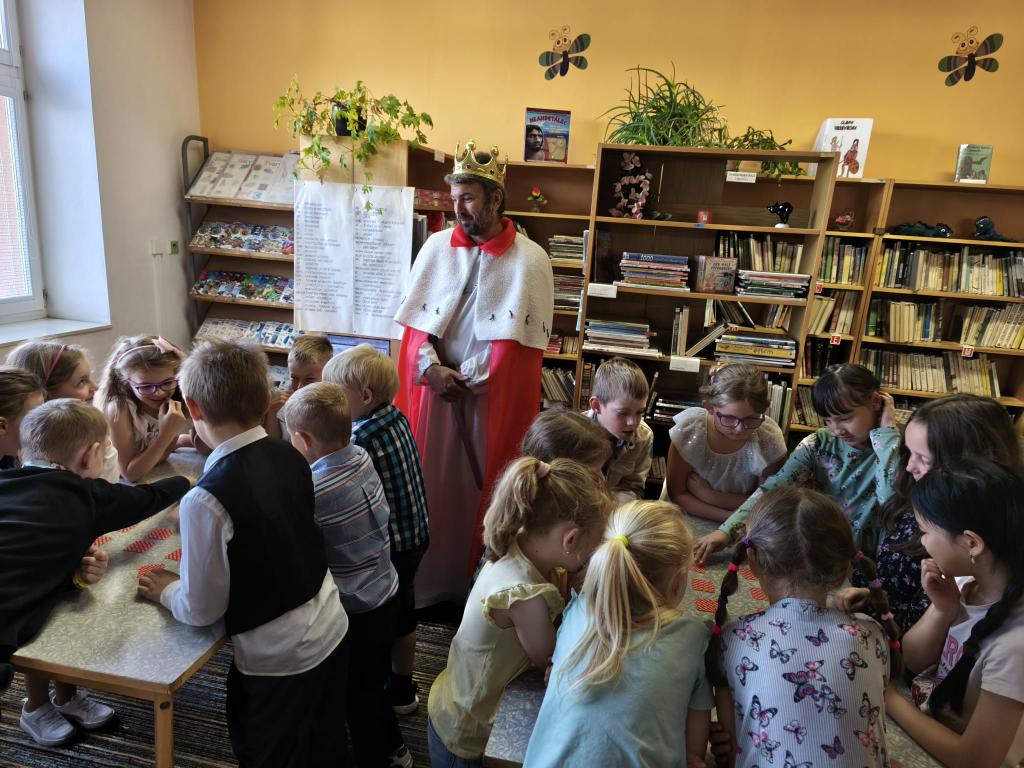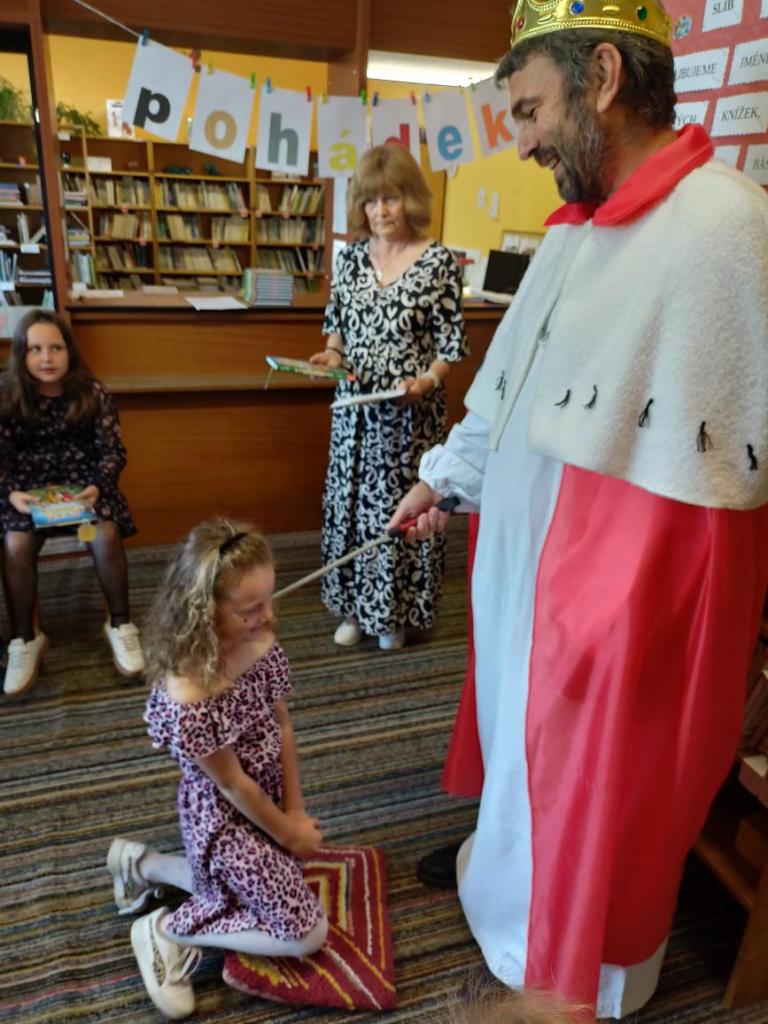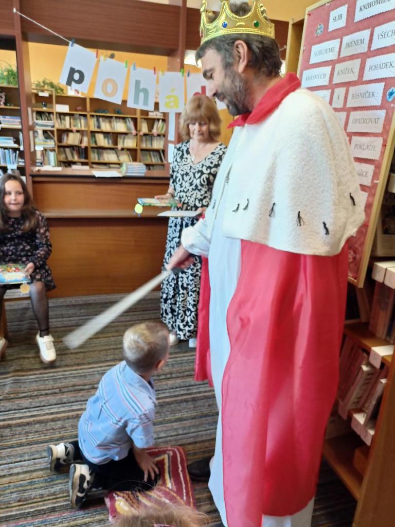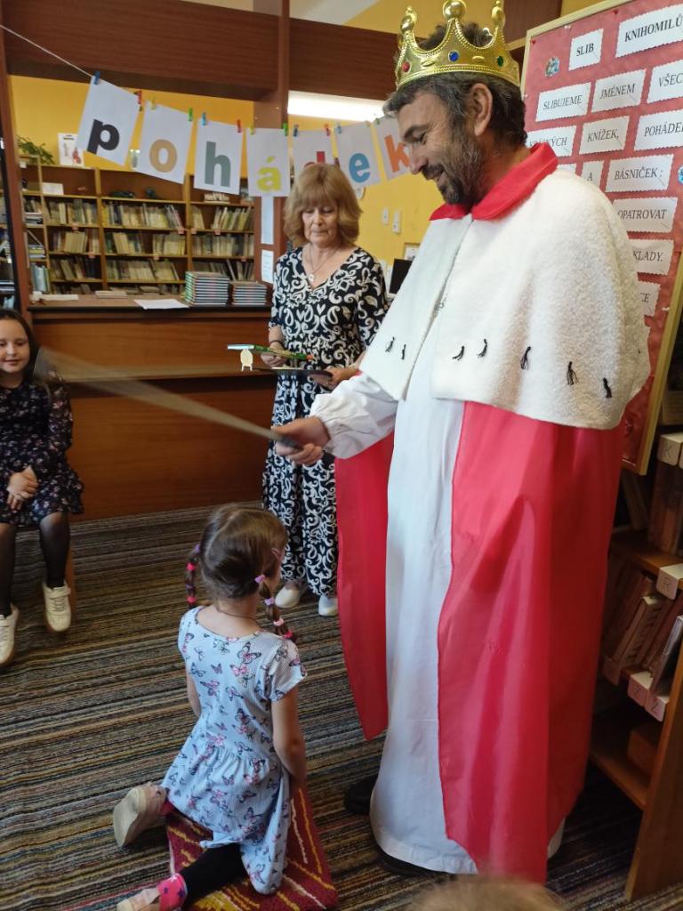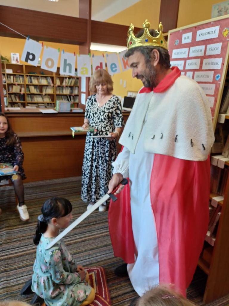 V Městské knihovně Kaznějov paní knihovnice Soňa Tůmová připravila pro děti slavnostní PASOVÁNÍ NA ČTENÁŘE. Děti četly pohádkový příběh, poté za zvuku fanfáry přišel mezi nás pan král a společně jsme přečetli SLIB KNIHOMOLŮ. Následně pan král děti pasoval svým mečem na čtenáře.