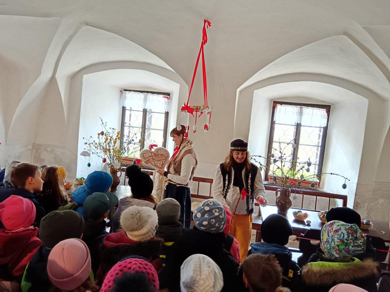 Anička dětem také ukázala barevné pentličky, které se vážou na pomlázku. Dozvěděly se, co jednotlivé barvy symbolizují, a nahlédly tak do významu velikonočních zvyků. Nechyběla ani veselá scénka s chasníkem Toníkem, která dětem přiblížila tradice spojené s velikonočním pondělím.
