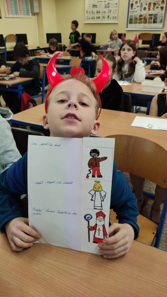 Jedna vyučovací hodina byla věnovaná oblíbenému triu čert – Mikuláš – anděl, kdy žáci porovnávali, jak tato tradice vypadá u nás, v anglicky i německy mluvících zemích. Děti z prvního stupně se shodly na tom, že by 5.12. raději bydlely v Anglii, kde se čert vůbec nevyskytuje. Zato do Rakouska by se v tento den dostat ani omylem nechtěly.