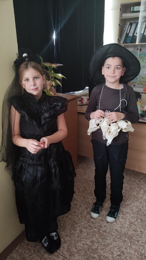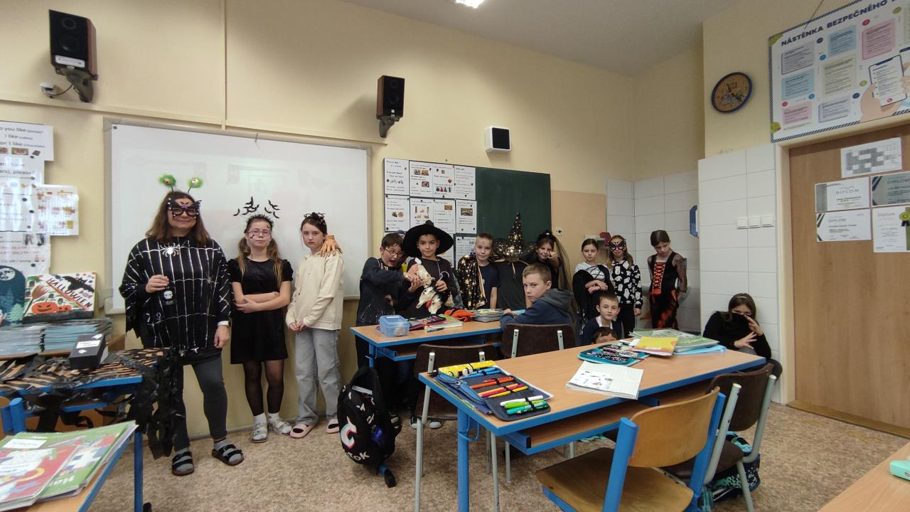 Nechyběla ani soutěž o nejhezčí kostým – výběr byl opravdu těžký, protože nápadité masky se tu jen hemžily! Ve 4.B se o 1. místo podělili Dianka Fránová alias Wednesday, Lucka Luňáčková jako čarodějnice a Patrik Blažek jako čaroděj s lebkami zvířat kolem krku.