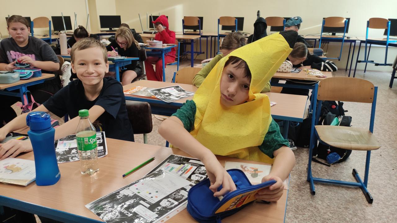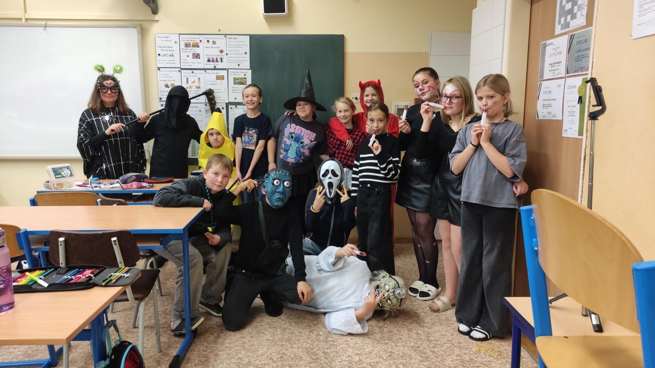 Nechyběla ani soutěž o nejhezčí kostým – výběr byl opravdu těžký, protože nápadité masky se tu jen hemžily! V 5.A zvítězil se stejným počtem hlasů Matěj Habrych ve vlastnoručně vyrobeném kostýmu banánu a dvojčecí strašidelné duo Eliška Třísková a Ema Bečvářová.