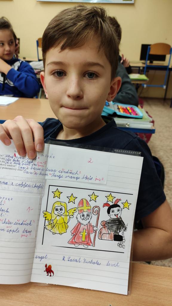 Na ostrovech se tento světec přerodil v postavu zvanou Father Christmas, která je k nerozeznání podobná americkému Santa Clausovi a plní obdobné úkoly - ovšem až o Vánocích. To nám však nevadilo. Přeložili jsme si slovíčka vztahující se k této české tradici do angličtiny a vybarvili si tyto tři nám známé postavy v duchu „volnější hodiny“ aneb i anglické reálie jsou důležité. V závěru hodiny jsme si s YouTube zazpívali anglické písničky s mikulášskou a vánoční tématikou.