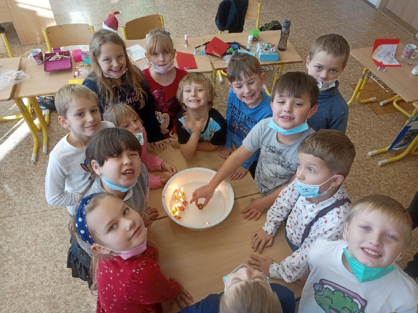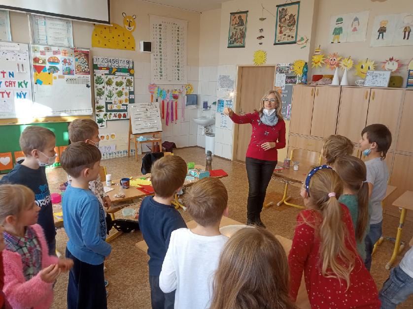 Podzim utekl jako voda a byly Vánoce. Nejprve jsme pozvali rodiče na školní zahradu, kde jsme poprvé pod širým nebem uspořádali Vánoční besídku plnou písniček, říkanek, básniček a koled. Nakonec jsme celou zahradu rozzářili prskavkami a rozveselili radostnou písničkou Vánoce přicházejí. O několik dní později jsme oslavili Vánoce také ve třídě. Kromě kapra bylo vše, co ke skutečným Vánocům patří. Pohoda, vyprávění o Ježíškovi, svíčky, prskavky, cukroví, teplý voňavý čaj, koledy. A také stromeček, zvoneček a spousta překvapení v podobě krásných dárečků. Nakonec jsme si popřáli „Šťastné a veselé“ …
