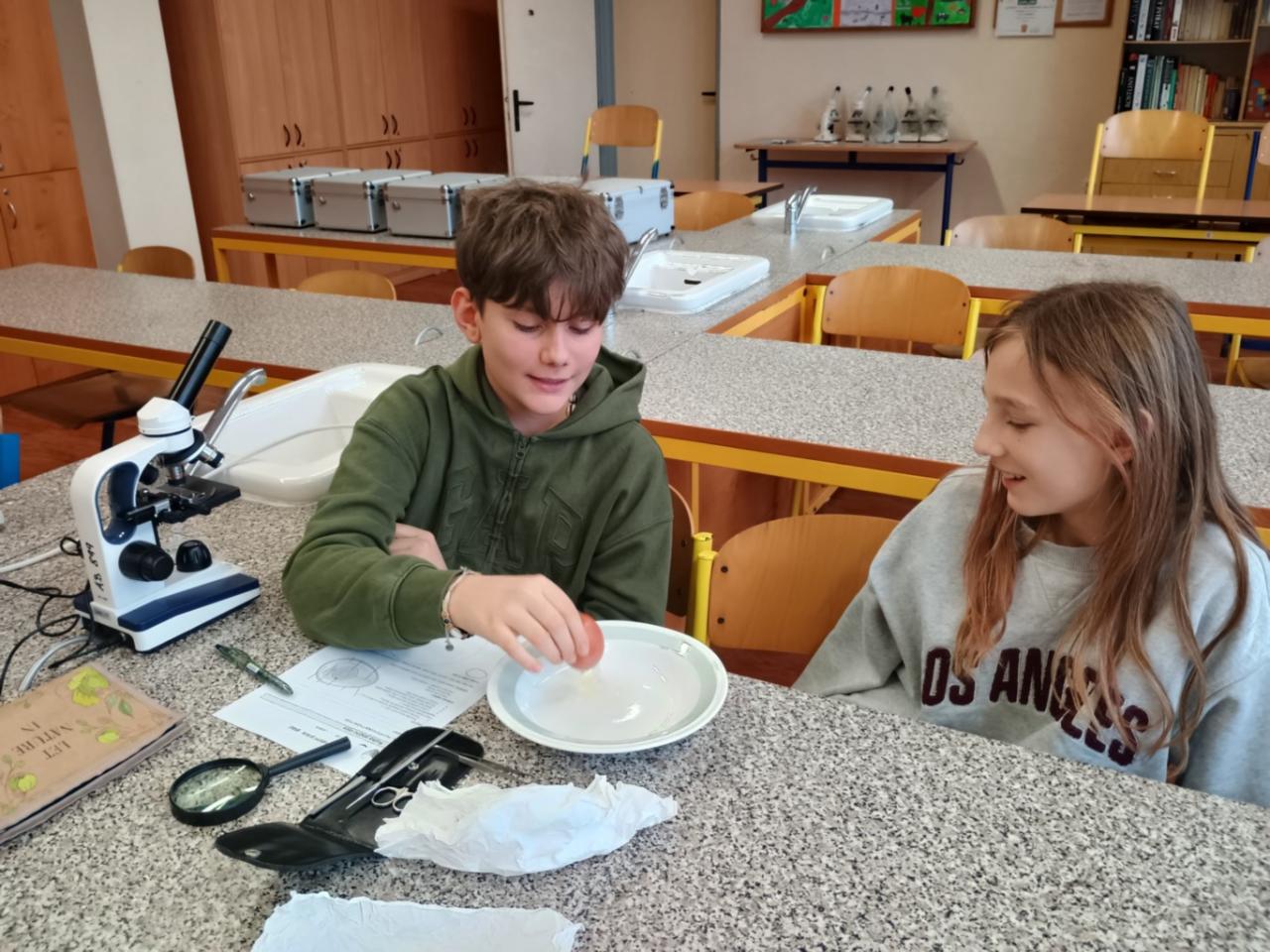 Následně žáci ve skupinách prozkoumávali vnější i vnitřní stavbu slepičího vejce. Opatrně narušili skořápku z tupé strany vajíčka, přes papírovou blánu a vzduchovou komůrku se postupně dostávali dovnitř. Nakonec vejce vylili do talíře a prozkoumali i zbytek jeho částí.